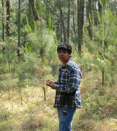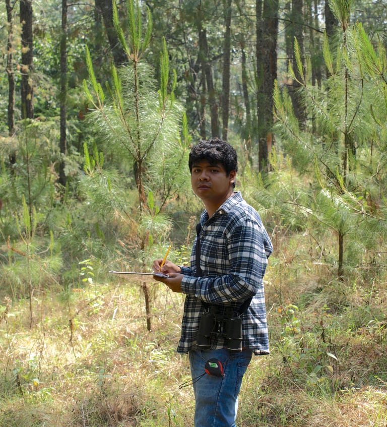 Chuchín es biólogo por la UMSNH. Él es un chico super entusiasta con un gran interés en el cambio climático y sus efectos sobre la biodiversidad. En su tesis exploró el estado de salud de pinos en la Comunidad Indígena de San Juan Parangaricutiro, Michoacán. Específicamente, él estudió la incidencia y frecuencia de síntomas y enfermedades de pinos y como cambian entre distintas altitudes. Actualmente es profesor en el Instituto Tecnológico Superior P'urhépecha en Cherán, Michoacán.